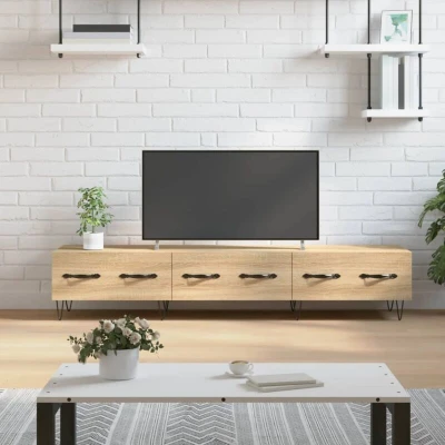 General description This sturdy TV cabinet is designed to be a focal point of your room with a trendy yet practical design. The engineered wood is of exceptional quality, featuring a smooth surface, strength, stability, and resistance to moisture. It is easy to clean and offers spacious storage with three drawers, making it ideal for storing magazines, DVDs, and other items. The sturdy top is perfect for displaying decorative items like photo frames and plants, while the iron legs add a calm style to your interior and ensure stability. Technical specifications Colour: Sonoma oak Material: Engineered wood, iron Dimensions: 150 x 36 x 30 cm (W x D x H) Assembly required: Yes Other information