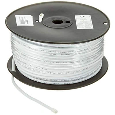TV Coaxial Cable 75 Ohm, 100 m Packet Coaxial Cable (CCS); 100 dB; 2x Shielded, 100 m on a Plastic Coil Class A For Indoor Installation With metre mark Class a CE attenuation at 20 ° C in dB / 100 m 100 MHz - 6.1 dB; 200 MHz - 7.7 dB; 300 MHz - 9.6 dB; 500 MHz - 13.4 dB; 800 MHz - 17.7 dB; 1000 MHz - 20.2 dB; 1350 MHz - 22.5 dB; 1750 MHz - 26.7 dB; 2050 MHz - 30.6 dB; 2150 MHz - 32.1 dB Inner conductor 1.1 mm CCS - outer diameter 6.8 mm - shielding strength > 100 dB - double shielding - 1. Umbrella aluminium foil - 2. Braid Net 128 - Length 100 m - Plastic Spool Packaging - Impedance 75 Ohm