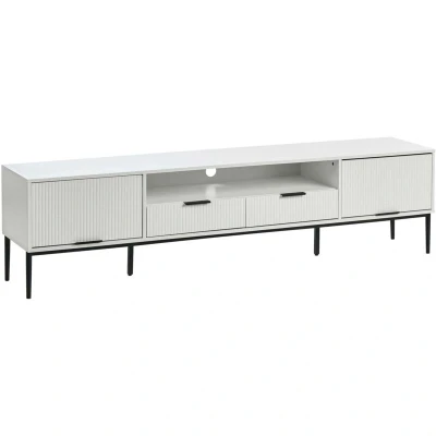 TV Cabinet with Ribbed Fronts for a TV. This TV stand is the perfect addition to any modern or Scandinavian-inspired interior. Made from durable MDF with a sleek, lacquered finish, it offers a shiny, elegant look, while the stable metal legs provide lasting support. With plenty of storage space and ribbed fronts adding a stylish touch, it’s both practical and chic for your living room. Details: Product Type: TV Stand General Color: White, Black Material Type: Engineered Wood Main Material: MDF Additional Material: Iron Legs material: Metal Top Material: Engineered Wood Shelves number: 3 Doors Opening: Lift-Down Drawers: Yes Finish: Lacquered Number of Doors: 2 Number of Drawers: 2 Dimensions: Depth: 40 cm Width: 200 cm Height: 52 cm Weight: 38 kg Drawer Weight Capacity: 5 kg Shelf Weight Capacity: 10 kg Top Weight Capacity: 20 kg Offer Includes: 1 x TV Stand Key Features: With Cable Management, Modern Design, Stable and Durable Construction, Ample Space for Storage Assembly