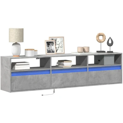 ManoManoGeneral description This TV wall cabinet is the perfect solution for your living space to maximize space and keep the floor areas uncluttered. It features a wall-mounted design that adds extra storage space while maintaining a clean area. The cabinet is made from engineered wood, which is durable and stable, resistant to moisture, warping, and splitting. Additionally, it includes RGB LED lights that can be customized for color, mode, and brightness to enhance the ambience of your interior. Technical specifications Colour: Concrete grey Material: Engineered wood Dimensions: 180 x 31 x 45 cm (W x D x H) Maximum load capacity (total): 60 kg Maximum load capacity (top): 45 kg Maximum load capacity (per drawer): 5 kg Assembly required: Yes Installation Screws and plugs for inside the wall are not included; use suitable screws and plugs for your wall type. A wall attachment device is provided, but you will need to source suitable fixings for your wall type. Check for any electrical wires or