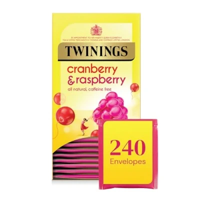 This pack contains 12 boxes of 20 invidivually wrapped enveloped tea bags. Perfect for offices, cafes or other shared spaces The deep-red colour and zing of cranberries help to make this infusion crisp and refreshing, while the raspberry notes bring a touch of sweetness to this mouth-watering blend. Made with all-natural ingredients, nothing more, nothing less. Naturally caffeine-free with no added sugar, enjoy any time of the day. Fancy yours chilled? Allow the infusion to cool before adding some ice and a few fresh raspberries.