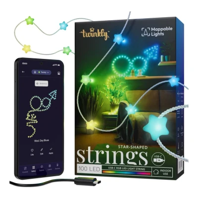 Currys- These Twinkly Candies string lights bring some sparkle with 100 star-shaped RGB LEDs- Powered by USB-C, you can just plug them into a power bank, laptop or smart home hub- With the Twinkly app, you can design, tweak and sync your lights to match your mood or your playlist- Its mapping tech uses your phone camera to place effects precisely, so every sparkle lands just right- Link up with Razer Chroma RGB or OMEN Light Studio for reactive lighting that responds to your every move- Compatible with Alexa, Google Assistant, and Apple HomeKit, you can control your lighting handsfree
