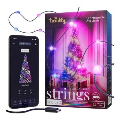 Twinkly Strings USB C Pearls 200 LED, Pearl Shaped LED Light String, Christmas Lights, RGB Multicolor Mappable LEDs, Compatible with Alexa, Google Home, Power, Green Wire, 12m