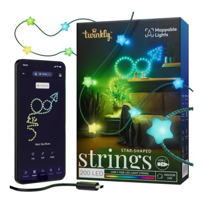 - These Twinkly string lights bring sparkle to your space with 200 star-shaped RGB LEDs- Powered by USB-C, you can just plug them into a power bank, laptop or smart home hub- With the Twinkly app, you can design, tweak and sync your lights to match your mood or your playlist- Its mapping tech uses your phone camera to place effects precisely, so every sparkle lands just right- Link up with Razer Chroma RGB or OMEN Light Studio for reactive lighting that responds to your every move- Compatible with Alexa, Google Assistant, and Apple HomeKit, you can control your lighting handsfree
