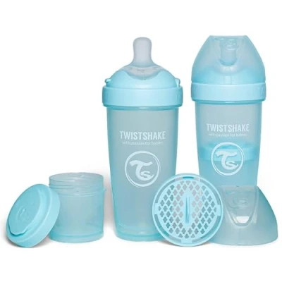 Twistshake 2X Pro Double Anti Colic Bottles with Powdered Milk Container 330 ml Fast Flow Silicone Breast Shaped Nipple BPA Free Suitable for Babies 4m+ Blue