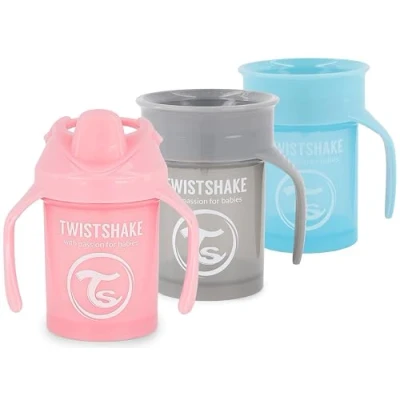 360 drinking – let your baby practice drinking from the open cup and prepare for it. The 360 rim allows your child to drink from anywhere on the rim of the cup. Comfortable handle – the 360 cup and the mini cup have a soft training handle for a comfortable grip that allows your baby to learn to drink easily. Fruitsplash – Mini Cup have a unique fruit blender that crushes the fruit in the sippy cup, so you can prepare a delicious, healthy drink for the meal. Protective cap – the lid of the Twistshake drinking cup protects the contents from dirt and dust, perfect for on the go. Included components – 2 x Twistshake 360 cup 230 ml, 6+ months, grey and blue; 1 x Twistshake mini cup 230 ml, 4+ months, pastel pink.
