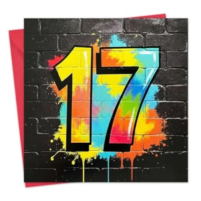 BLANK INSIDE : This card is blank inside for your own personal message. FRONT : Message on the front of the card reads - "17" SIZE : This fabulous greeting card is 15.5 x 15.5 cm and the envelope is perfectly sized at 16 x 16 cm. HIGH QUALITY : This card is professionally printed on thick board and also comes with a Red envelope. UK PRODUCT : Designed, printed and manufactured exclusively in the UK. TWIZLER : Small, family-run, UK-based business. SHIPPING : Express options available on checkout. PROTECTION : Each card comes individually cello wrapped for extra protection. SEND TO : Ideal for friend, son, brother, teenager, or anyone celebrating their 17th birthday.
