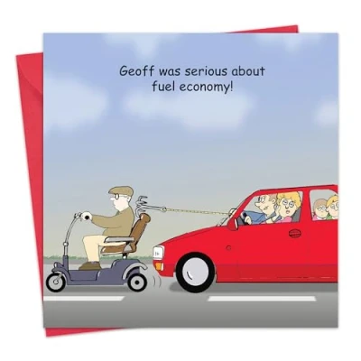 This card is left blank inside for you to create your own personal message A humorous card to make that special someone chuckle. The words on the front of the card reads – ‘Geoff was serious about fuel economy!’ Great card for a husband, wife, grandad, nan, dad, mum, uncle, aunt, son, daughter, brother, sister, boyfriend, girlfriend, partner, nephew, niece, cousin, friend, adult, grandpa, gramps, grandfather, nanny, nanna, grandma, granny or grandmother. Cello wrapped and comes with matching coloured envelope Designed, printed and manufactured exclusively in the UK