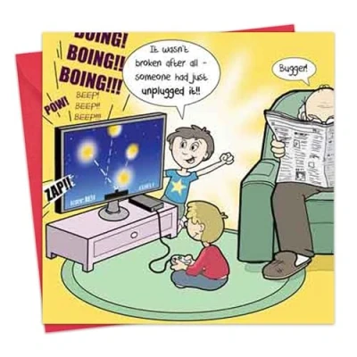 This card is left blank inside for you to create your own personal message A humorous card to make that special someone chuckle. The words on the front of the card reads – ‘It wasn’t broken after all – someone had just unplugged it!’ and Grandad is saying ‘Bugger!’ The words on the wall read ‘Boing, Boing, Boing, Beep, Beep, Beep, Pow and Zap!’ Great card for a husband, wife, grandad, nan, dad, mum, uncle, aunt, son, daughter, brother, sister, boyfriend, girlfriend, partner, nephew, niece, grandson, granddaughter, friend, cousin, adult, grandpa, gramps, grandfather, nanny, nanna, grandma, granny, grandmother or teenager. Cello wrapped and comes with matching coloured envelope Designed, printed and manufactured exclusively in the UK