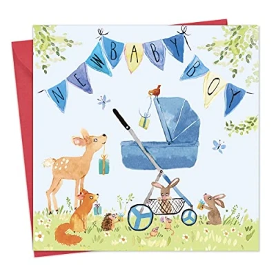 Twizler New Baby Boy Card with Blue Pram, Bunting and Woodland Animals Newborn Essentials Congratulations Cute Gifts