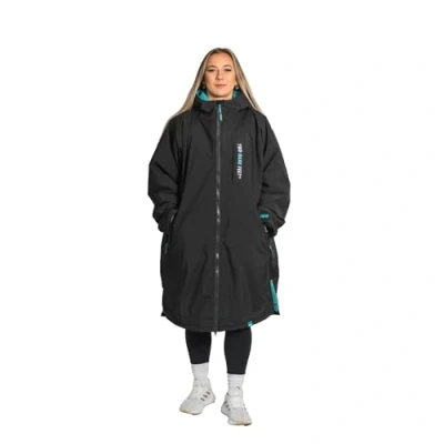 Two Bare Feet Waterproof Long Sleeve Changing Robe with Hood & Mat, Sherpa Fleece Lining, Windproof, Warm, for Watersports, Swimming, Surfing, SUP (Large, Black/Teal)