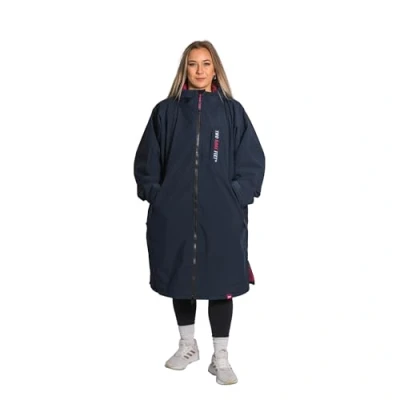 Two Bare Feet Waterproof Long Sleeve Changing Robe with Hood & Mat, Sherpa Fleece Lining, Windproof, Warm, for Watersports, Swimming, Surfing, SUP (Small, Navy/Raspberry)
