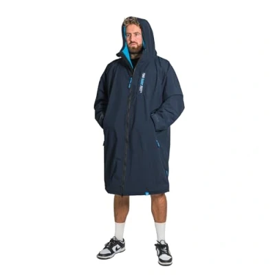 Two Bare Feet Weatherproof Long Sleeve Changing Robe and Mat, Waterproof, Windproof, Soft, Warm Sherpa Fleece Lining with Hood, Watersports, Swimming, Surfing, SUP (Small, Navy/Blue)