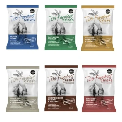 PREMIUM HAND-COOKED CRISPS - We lovingly produce delicious hand-cooked crisps. We only use potatoes grown on our Herefordshire farm. We slice & hand-cook our crisps in small batches using renewable energy. They are flavoured with the finest locally sourced ingredients to create a fresh taste & great crunch HEREFORDSHIRE HERITAGE - We are proud Herefordshire farmers & want to showcase what our county has to offer - Our ingredients are either grown by us or sourced from only the best local producers COMPOSTABLE PACKAGING - Two Farmers is the UK’s first 100% compostable & plastic-free crisp brand - Our packets which break down into water carbon dioxide & biomass are made from cellulose & sustainably grown eucalyptus trees from managed plantations OUR ECO ETHOS - We are committed to giving back to the environment which is why we keep our road miles low and use 100% compostable packaging - Our potatoes are stored, cooked & packed using renewable energy where possible on our Herefordshire farm