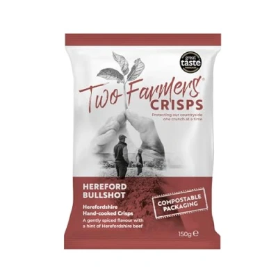 OUR CRISPS - Our own farm grown potatoes gently seasoned with spices and the delicious flavour of the finest Hereford beef- Only the finest potatoes make their way into our crisp packets. HAND COOKED - We produce lovingly hand-cooked crisps using potatoes grown on our Herefordshire farm - We slice & hand-cook our crisps in small batches flavouring them with the finest locally sourced ingredients to create a fresh taste & great crunch HEREFORDSHIRE HERITAGE - We are proud Herefordshire farmers & want to showcase what our county has to offer - Most of our ingredients are grown by us & for those we can’t we have sourced from the best local producers to add to our mouth-watering flavours COMPOSTABLE PACKAGING - Two Farmers is the UK’s first 100% compostable & plastic-free crisp brand - Our packets which break down into water carbon dioxide & biomass are made from cellulose and sustainably grown eucalyptus trees from managed plantations. OUR ECO ETHOS - We are committed to giving back to the environment which is why we keep our road miles low and use 100% compostable packaging - Our potatoes are stored, cooked, and packed using renewable energy where possible on our Herefordshire farm