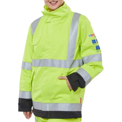 Fire Retardant, Hi Vis, Anti-static, ARC Flash Jacket. 300gsm 60/40 Modacrylic/cotton blend. Triple stitch construction. 2 Lower pockets. Large qualifying icons on left arm. EN ISO 13688:2013 - General requirements for protective clothing EN ISO 20471:2013 Class 3 - Test method for high visibility EN 1149-3:2004 - Anti Static - Test methods for measurements of charge decay EN 1149-5:2008 - Anti Static - Material performance and design requirements EN ISO 11611:2015 (Class 1 A1 A2) - Protective clothing for use in welding EN ISO 11612:2015 (A1 A2 B1 C1) - Protection against heat and flameARC FLASHIEC 61482-2:2009 - Performance requirements and design requirementsEN 61482-1-2:2007 (Class 1 = 4kA) - Box Arc testingEN 61482-1-1:2009 (ATPV = 10.8 Cal/cm2) - Open Arc testing Each garment style is independently tested to both box and open ARC standards. Click ARC production is covered by article 11B certification.