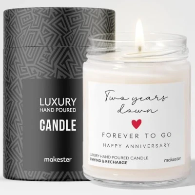 Two Years Down Candle Luxury Soy Wax Anniversary Gift Madagascan Vanilla, Jasmine, Sugared Almond 2nd Cotton Makester