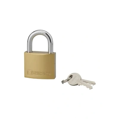 Type 1 Padlock with Shackle, 50 mm, Golden for Indoor Use Double Pin Lock Brass Body and 2 Steel Keys Shackle Diameter 9 Height 24 Useful Width 25 Nickel Plated Hardened