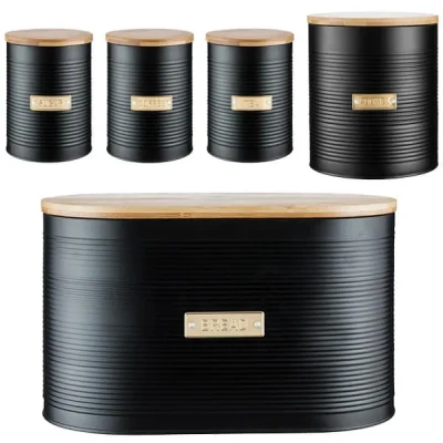 Invest in practicality with Typhoon Otto Black 5 Piece Kitchen Set. This set consists of Tea, Coffee & Sugar storage canisters with the matching bread bin and cookie storage. Each have a matt black, ribbed design which beautifully elevates the aesthetic of any kitchen workspace.Reinforced with a coated steel exterior and Bamboo lid, this storage set is built to endure the demands of daily life, offering long-lasting durability and guarantees long lasting freshness. The addition of gold badges adds a touch of elegance, serving as both decorative accents and functional markers to keep your kitchen essentials neatly organized and readily accessible.Tea, Sugar & Coffee Canisters - Dimensions: L11cm x W11cm x H15cm.Bread Bin - Dimensions: L34cm x W19.5cm x H20.6cm.Cookie Storage - Dimensions: L16cm x W16cm x H19cm.