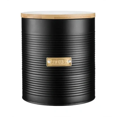 General description This Typhoon Otto Black Cookie Storage canister is durable and hard-wearing, featuring a sustainably sourced bamboo wood lid. It is designed to keep your sweet treats and cookies fresh with its silicone seal. Technical specifications Material: Coated steel exterior Color: Matte black Height: 19 cm Diameter: 16 cm Other information Attractive ribbed design with gold tag embellishment Contrasting bamboo lid with airtight silicone seal Famed Typhoon quality Combine with other items in the range for an elegant kitchen look