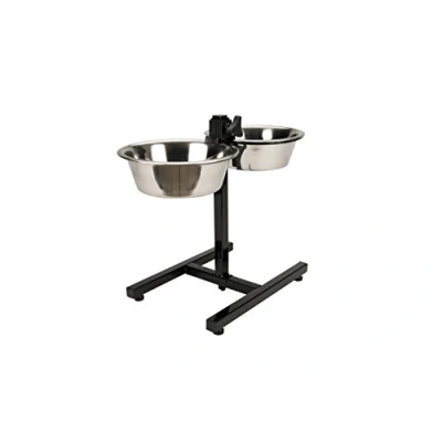 Height-adjustable bowl holder 2 stainless steel bowls, resistant and easy to maintain High stability of the support thanks to its "H" shape Maintaining bowls with a pressure fastening system Ideal for having both water and food