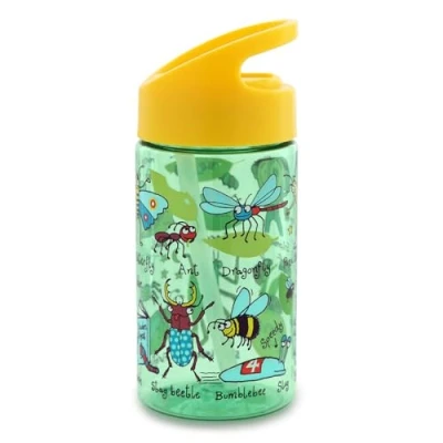 Kids Flip Top Water Bottle, made from high-quality hard wearing Tritan, scratch resistant, drop resistant, lightweight with a sturdy carry handle Flawlessly detailed prints. Fun insect & bug Illustrations including caterpillars, beetles, dragonflies, slugs, & stick insects Easy to use: Kids love drinking from the popup nozzle and straw. Leak proof design, no need toworry about messy spills Easy to clean: All parts can be removed and are dishwasher safe Safe, BPA, and Phthalate free. No funny tastes or smells. 400ml Capacity