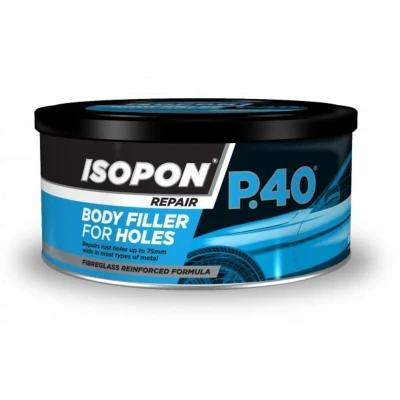 General description U-Pol ISOPON P.40 Body Filler for Holes is the ideal choice for repairing and priming rust holes up to 75mm wide in most types of metal, making it ready for painting. This two-component bridging filler paste is specifically designed to repair damaged body panels on vehicles. Technical specifications Volume: 600ml MPN: P40/1 EAN: 5010796070021 Type: Body Filler Installation For bare steel: Degrease and abrade with P80 paper, removing all traces of rust. For original paint surfaces (except thermoplastic acrylics): Degrease and abrade back to bare metal with P180 paper. Usage Very durable and can be sanded and shaped if required. Easily covered with standard polyester filler. Can be over-painted directly. Waterproof. Other information