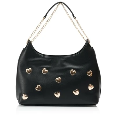 Faux leather shoulder bag With gold hearts Link chain with shoulder piece Zip pocket on the back Textile inner lining with side pocket
