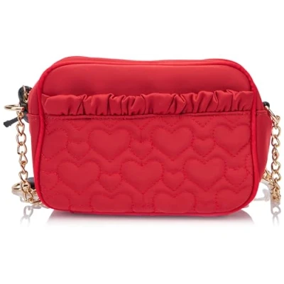 Quilted heart print bag Long shoulder strap with chain links Decorated with ruffles Zip closure Inner pocket