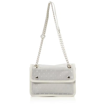 Mesh handbag Embroidered with polka dots Zip with heart pendant Flap with magnetic closure Textile inner lining