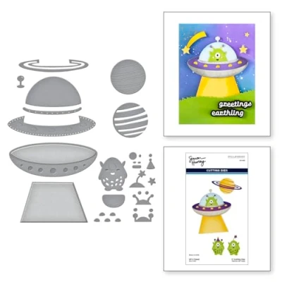 Space Adventure Collection by Simon Hurley Etched Dies 95% Spring Steel, 5% Lead Free Paint Finished UFO Ship: 3.28 x 2.31" 8.3 x 5.9 cm; Finished Planet: 2.45 x 1.31" 6.2 x 3.3 cm; Beaming Light: 2.53 x 1.52" 6.4 x 3.9 cm; Finished Alien: 1.07 x 1.38" 2.7 x 3.5 cm