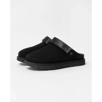 The UGG Goldenstar Clog boasts a clean silhouette that highlights its thoughtful detailing. The sleek black finish adds a timeless touch, ensuring it complements an array of outfits. Whether you're layering it with jeans, slipping it on with chinos, or pairing it with trendy streetwear, this clog enhances your style effortlessly. The unique heel strap features a swivel design, allowing you to wear it in two distinct ways: as a classic heel strap or stacked on top of the vamp for a chic flair.