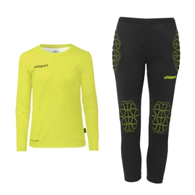 Box contents: complete goalkeeper set consisting of top and trousers. The material is made from 100% recaceltem polyester. Suitable for football training and game (goalkeeper or player). Children's football and goalkeeper jersey. The top: made from 100% recycled polyester + Smartbreathe Lite, the shirt is a real all-rounder and perfect for goalkeeper training or as a goalkeeper jersey. In addition, the shirt also performs visually with sublimation print. The trousers: made from 100% recycled polyester. Flexible with elastic waistband and drawstring - without inner briefs. Printed uhlsport lettering on the left leg and versatile. Goalkeeper jersey set for kids and teenagers Brand: uhlsport