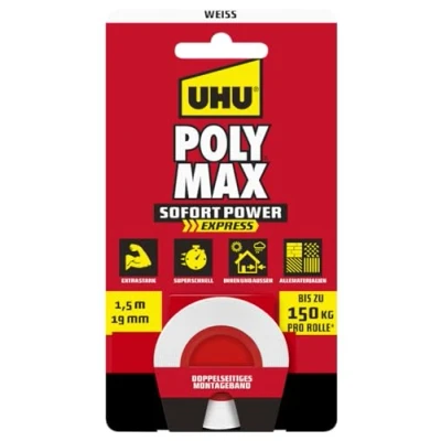 UHU Poly Max double tape - high-performance double tape with high-tack instant adhesion Super strong adhesive force of up to 150 kg per roll Universal use on many materials indoors and outdoors, UV and temperature resistant from -20 °C to +80 °C Sustainable outer packaging without plastic Ideal for smaller assembly work and as a support for large assembly work in combination with mounting adhesives, Manufacturer: UHU GmbH & Co. KG