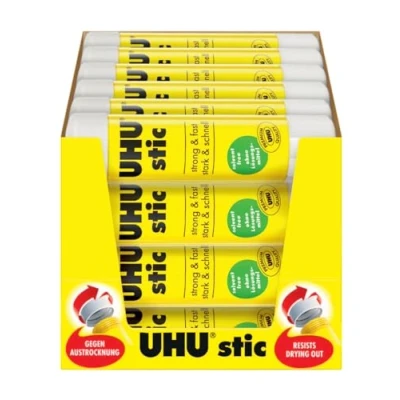 The iconic glue stick ideal for school, crafts, office, an essential Solvent-free glue formula with 98% natural ingredients (including water) Sticks quickly and permanently Spreads evenly Quick drying in 45 seconds Suitable for sticking paper, cardboard, photos, textile and many more! Cold wash UHU Accompanies you in all your crafts, DIY and DIY projects, Manufacturer: UHU