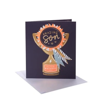 BIRTHDAY CARD - Make any birthday extra special with a thoughtful unique birthday card. A simple yet meaningful way to spread joy and celebration, whatever the age or occasion! DESIGN - For an amazing son, this fun trophy birthday card features gold foil details and is printed on premium quality board. GIFTS FOR MEN - Make his day with a thoughtful card. From birthday cards to thank you cards, our collection offers the perfect words to show him how much he’s appreciated. SIZE - This card measures 165 x 190 mm, ample space for a personal message, and a perfect size for displaying as a keepsake in your home. HIGH QUALITY & SUSTAINABLE - Our products are crafted from high-quality material, ensuring durability and a premium feel. We use materials from responsibly managed forests and controlled sources, certified by the Forest Stewardship Council (FSC). UK GREETINGS - For more than 100 years we've been proud to create products that help people connect. As part of the American Greetings family, we've grown as a greeting card supplier to become a market leading, direct-to-retail greeting card supplier in the UK.