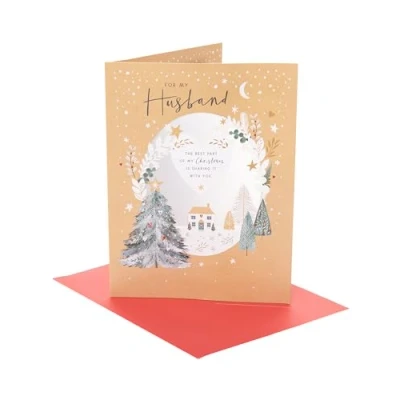 UK Greetings Christmas Card for Husband Xmas Presents Him, Boys, Men House and trees scene With Envelope 27.5 x 21 cm
