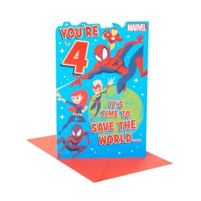 BIRTHDAY CARD - Make any birthday extra special with a thoughtful unique birthday card. A simple yet meaningful way to spread joy and celebration, whatever the age or occasion! DESIGN - With an awesome pop - up and all their favourite Avengers characters, this Marvel card is sure to bring a smile on their 4th birthday. Blank Inside For Your Own Message. GIFTS FOR MEN - Make his day with a thoughtful card. From birthday cards to thank you cards, our collection offers the perfect words to show him how much he’s appreciated. SIZE - This card measures 155 x 235 mm, ample space for a personal message, and a perfect size for displaying as a keepsake in your home. HIGH QUALITY & SUSTAINABLE - Our products are crafted from high-quality material, ensuring durability and a premium feel. We use materials from responsibly managed forests and controlled sources, certified by the Forest Stewardship Council (FSC). UK GREETINGS - For more than 100 years we've been proud to create products that help people connect. As part of the American Greetings family, we've grown as a greeting card supplier to become a market leading, direct-to-retail greeting card supplier in the UK.