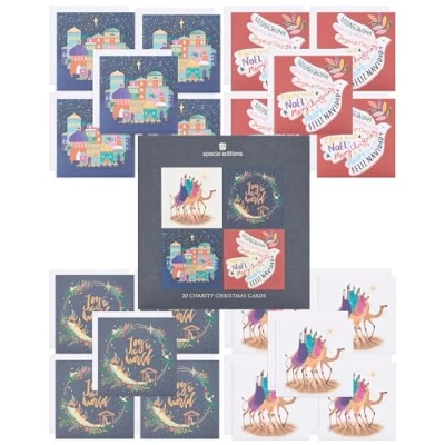 CHRISTMAS CARD - Spread the Christmas cheer with this pack of 20 religious cards. Featuring four colourful designs, accented with gold foil detailing, 60p from each sale goes to charity. DESIGN – Wish a special someone a Merry Christmas with this charming Christmas card, filled with a heartfelt message and a mix of 4 religious designs! GIFT IDEAS - No matter the occasion, a well-chosen card will make anyone's day. From birthday cards to thank you cards, our collection offers something for every occasion. SIZE - This card measures 15 x 15cm, ample space for a personal message, and a perfect size for displaying as a keepsake in your home. HIGH QUALITY & SUSTAINABLE - Our products are crafted from high-quality material, ensuring durability and a premium feel. We use materials from responsibly managed forests and controlled sources, certified by the Forest Stewardship Council (FSC).