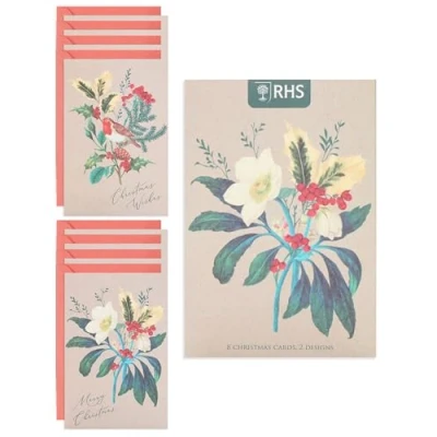 CHRISTMAS CARD - Spread the Christmas cheer with this pack of 8 Royal Horticultural Society cards. Featuring two floral designs, it’s sure to make your friends and family smile. DESIGN – Wish a special someone a Merry Christmas with this charming RHS Christmas card, filled with a heartfelt message and a cute rose & robin festive design! GIFT IDEAS - No matter the occasion, a well-chosen card will make anyone's day. From birthday cards to thank you cards, our collection offers something for every occasion. SIZE - This card measures 11 x 16cm, ample space for a personal message, and a perfect size for displaying as a keepsake in your home. HIGH QUALITY & SUSTAINABLE - Our products are crafted from high-quality material, ensuring durability and a premium feel. We use materials from responsibly managed forests and controlled sources, certified by the Forest Stewardship Council (FSC).