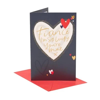 VALENTINE'S DAY - Let your fiancé know how lucky you feel to have him on Valentine's Day with this stylish card printed on premium quality recycled board. It features a red and black heart design with gold foil and embossed details. DESIGN – Celebrate love with this charming Valentine’s Day card, featuring a heartfelt message and a romantic, elegant design that’s perfect for your partner, spouse, or special someone on this meaningful day! GIFTS FOR MEN - Make his day with a thoughtful card. From birthday cards to thank you cards, our collection offers the perfect words to show him how much he’s appreciated. SIZE - This card measures 14.9 x 22.9 cm, ample space for a personal message, and a perfect size for displaying as a keepsake in your home. HIGH QUALITY & SUSTAINABLE - Our products are crafted from high-quality material, ensuring durability and a premium feel. We use materials from responsibly managed forests and controlled sources, certified by the Forest Stewardship Council (FSC). UK GREETINGS - For more than 100 years we've been proud to create products that help people connect. As part of the American Greetings family, we've grown as a greeting card supplier to become a market leading, direct-to-retail greeting card supplier in the UK.