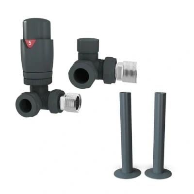 UK Radiators Stirling Bold Anthrcacite Thermostastic Radiator Valve Corner + 130mm Pipe Sleeves