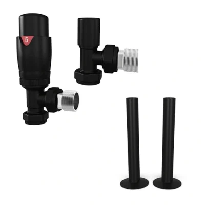 UK Radiators Stirling Bold Black Thermostastic Radiator Valve Angled + 130mm Pipe Sleeves