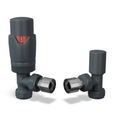 Efficient Heat Regulation with Thermostatic Control:This thermostatic radiator valve offers precise temperature regulation, allowing each room to stay at your preferred comfort level. Maintain ideal warmth while improving your heating system's efficiency. Stylish and Durable Anthracite Grey Finish:The modern textured anthracite grey finish of this radiator valve complements contemporary interiors while resisting daily wear and corrosion. A sleek solution that combines both form and function. Secure Fit for Standard 15mm Pipework:Designed for universal compatibility, this angled radiator valves 15mm model fits all standard 15mm pipework systems. Easy to install, it provides a leak-proof connection with a solid 1/2" BSP thread. Angled Lockshield for Precision Flow Control:The integrated lockshield gives you the ability to balance the system and regulate water flow. These grey radiator valves thermostatic design enhances system performance and reduces heat waste. Energy Efficient and Cost-Effective Solution:Reduce energy bills with this eco-friendly radiator thermostat valve. By adjusting room-by-room temperature levels, it ensures optimal heat without unnecessary energy usage or overheating., Manufacturer: UK Radiators