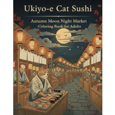Ukiyo e Cat Sushi: Autumn Moon Night Market: A Relaxing Style Coloring Book for Adults