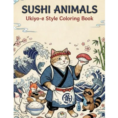 Ukiyo e style coloring book cover, sushi and animals