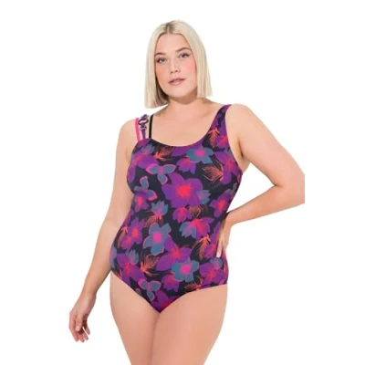 Ulla Popken Women's Badeanzug Fabienne, One Shoulder, Dark Lilac Flowers Piece Swimsuit, Black, 30