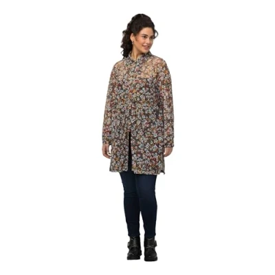 Slightly transparent mesh with Millefleur pattern Classic look with shirt collar Comfortable A-line Long sleeve with cuffs