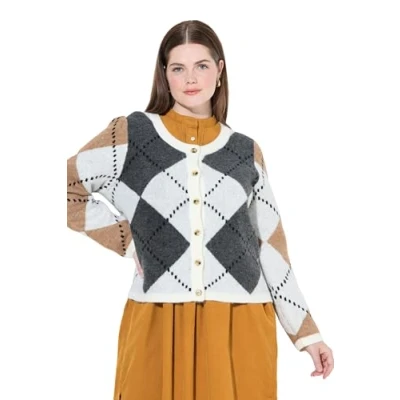 Ulla Popken Women's Strickjacke mit Argylemuster Pullover Sweater, Beige, 32 UK/34 UK