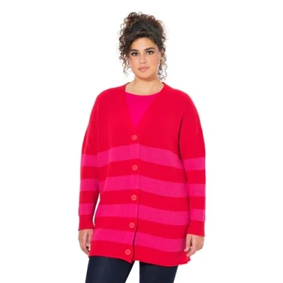 Ulla Popken Women's Strickjacke, Streifen, Boxy, V Ausschnitt, Rollkanten Cardigan Sweater, Lychee, 24 26'
